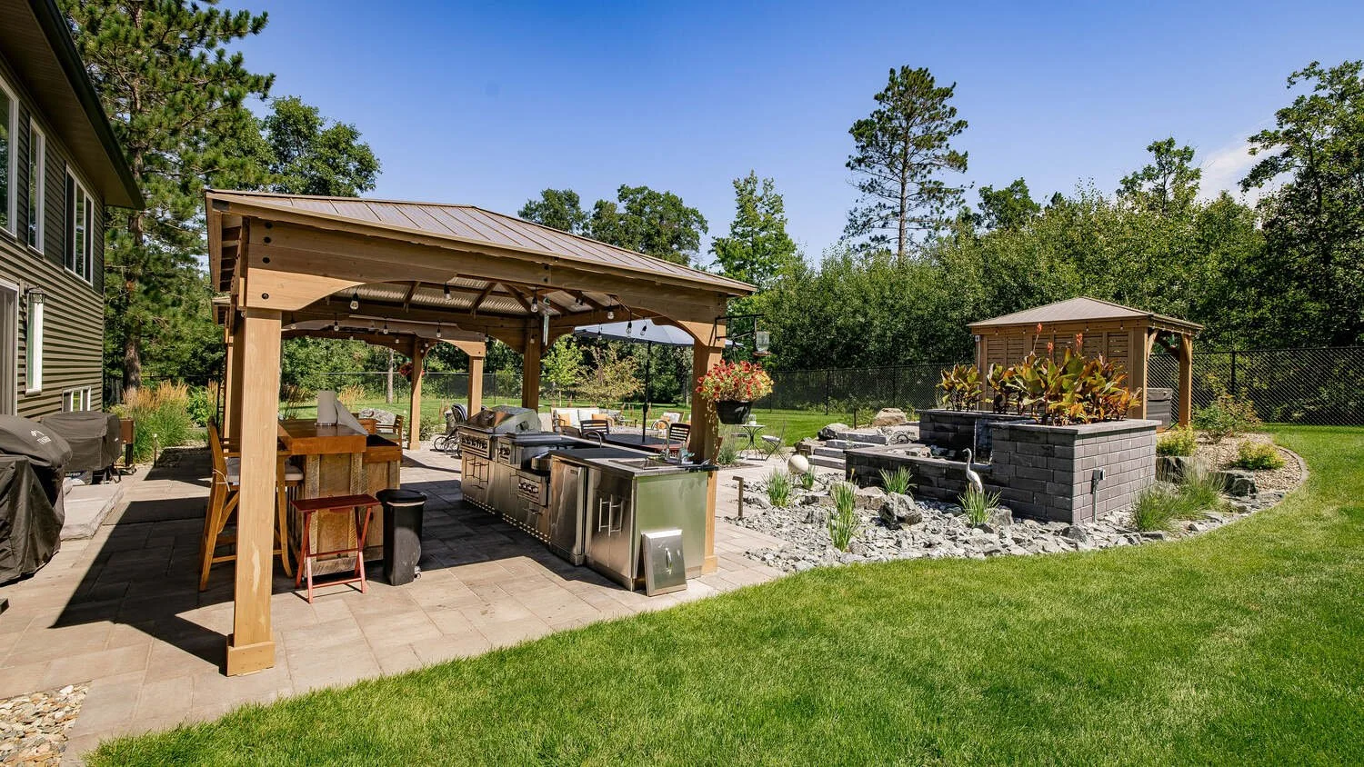 The fully equipped outdoor kitchen includes a built-in grill, ample counter space, and a protective roof structure for year-round usability.